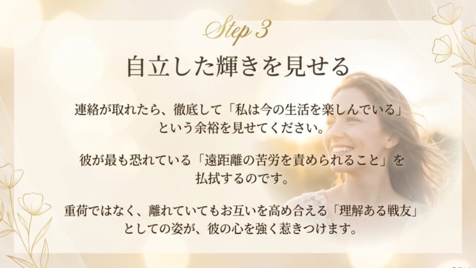 Q4. 遠距離になるのが嫌で別れた彼に、もう一度「遠距離でもいい」と思わせるには?A4. 言葉で説得するのではなく、あなたが自立して人生を楽しんでいる姿を見せることです。「この子となら、離れていてもお互いを高め合える」と彼に思わせた時、男性は初めて遠距離恋愛というリスクを取る決断をします。