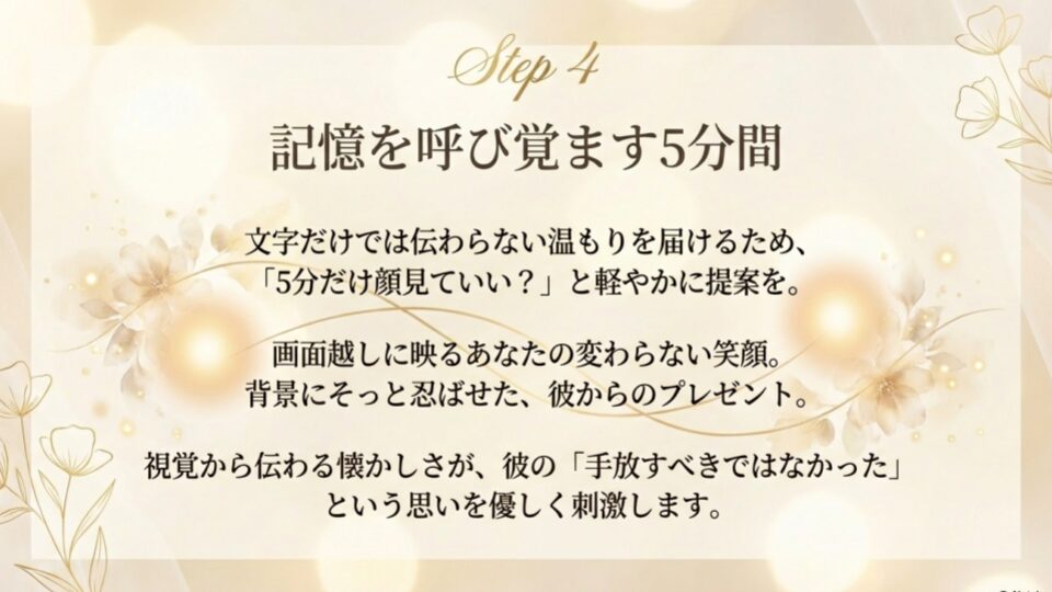 LINEの文字だけでは、心の距離は縮まりません。「5分だけ顔見ていい?」とハードルを下げてビデオ通話へ。背景に以前彼がプレゼントしてくれたものが映り込んでいたりすると、彼の「後悔」を優しく刺激できます(あざとくて結構!)。