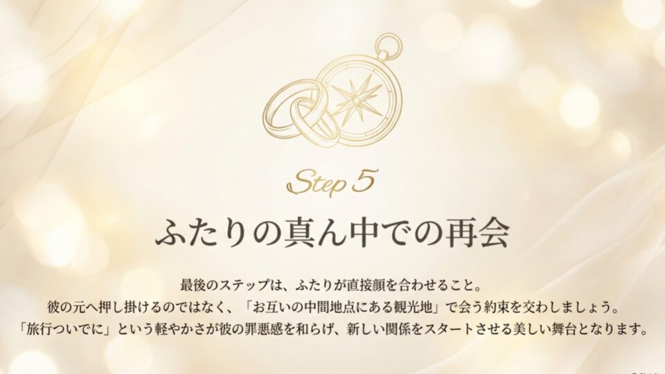復縁への最後のステップは、再会です。あなたが彼の元へ行くと「重荷」に感じさせてしまう可能性があるため、「お互いの中間地点にある観光地」などで会う約束を取り付けましょう。「旅行ついでに」という建前が、彼の罪悪感を和らげます。