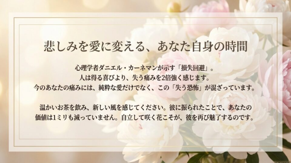 あなたは、本当に「彼」がいいのでしょうか。それとも「結婚を約束していた安心感」を失うのが怖いのでしょうか。心理学の世界には「損失回避」という言葉があります。人間は、何かを得る喜びよりも、持っていたものを失う痛みを2倍強く感じるという性質です(ダニエル・カーネマンの研究より)。