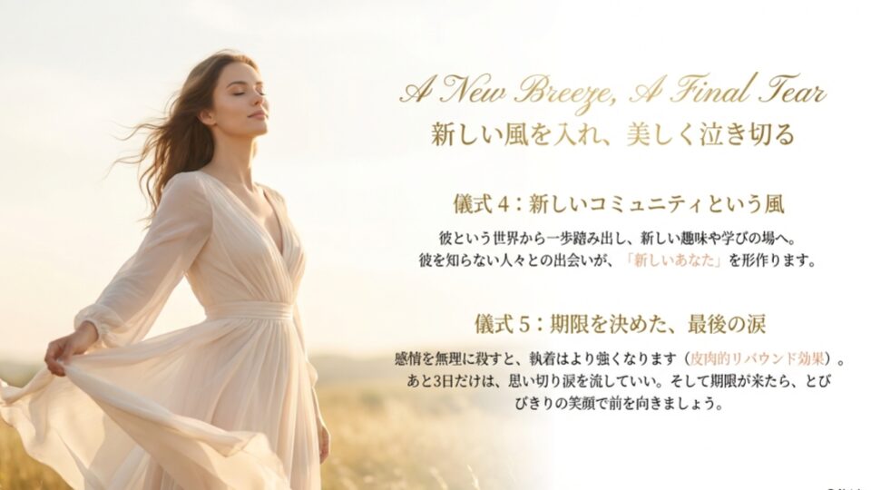 「もう諦めなきゃ」と無理に感情を押し殺すと、逆に執着は強まります(これを心理学で『皮肉的リバウンド効果』と呼びます)。だから、あと3日だけは、思いっきり泣いて、酒を飲み(ほどほどにね!)、彼の悪口を叫んでもいいことにしましょう。