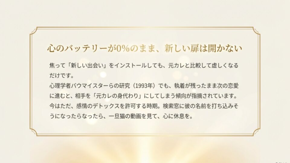 心理学者のバウマイスターらの研究(1993年)では、元パートナーへの執着が残ったまま次の恋愛に進むと、相手を「元カレの身代わり」として見てしまう傾向が指摘されています。これは相手にも、そして何よりあなた自身にとっても、誠実な選択とは言えません。