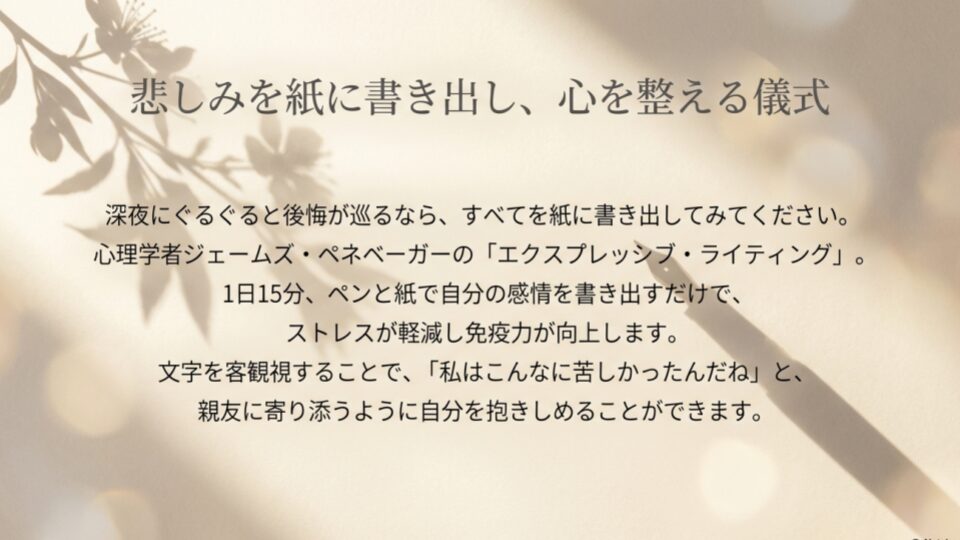 深夜、ぐるぐると同じ後悔が頭を回るなら、それをすべて紙に書き出してみてください。「あの時こう言えばよかった」「彼のあそこが嫌いだった」
