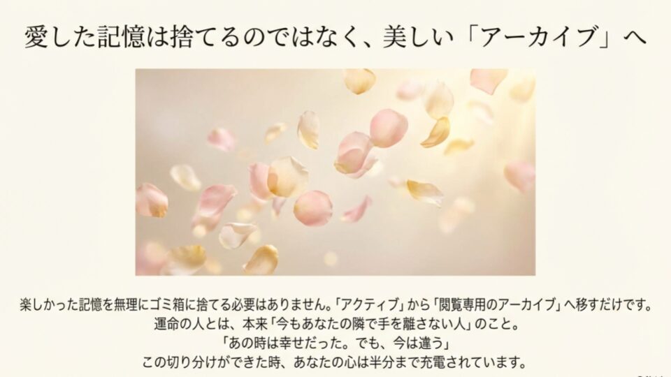 彼との楽しかった記憶を、無理にゴミ箱に捨てる必要はありません。ただ、今は「アクティブなフォルダ」から「閲覧専用のアーカイブフォルダ」へと移動させる作業が必要です。
