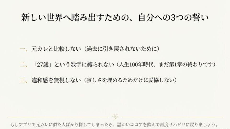 (もしアプリで「元カレに似た服の人」ばかりスワイプしている自分に気づいたら、一旦ブラウザを閉じて温かいココアを飲みましょう。それはまだ、心がリハビリ中である証拠です。)
