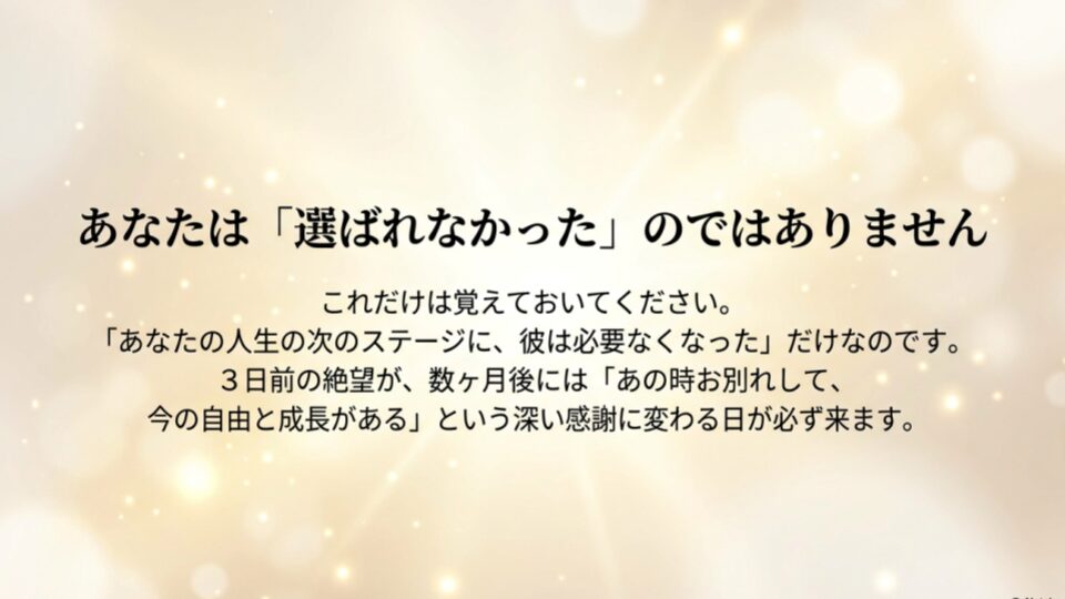 今はまだ、そう思えなくても大丈夫。3日前の絶望が、3ヶ月後には「あの時お別れして、今の自由があるんだ」という感謝に変わっている可能性は十分にあります。