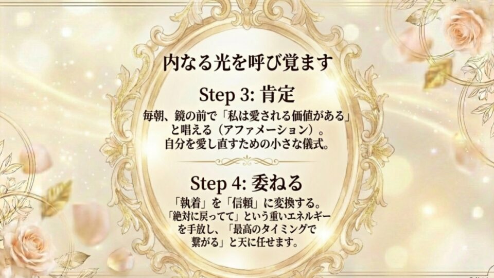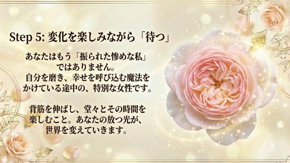 代わりに、「私は幸せになる準備ができている。彼との縁があるなら、最高のタイミングで繋がる」と天に任せるイメージを持ってください。肩の力が抜けた時、人は最も魅力的になります。